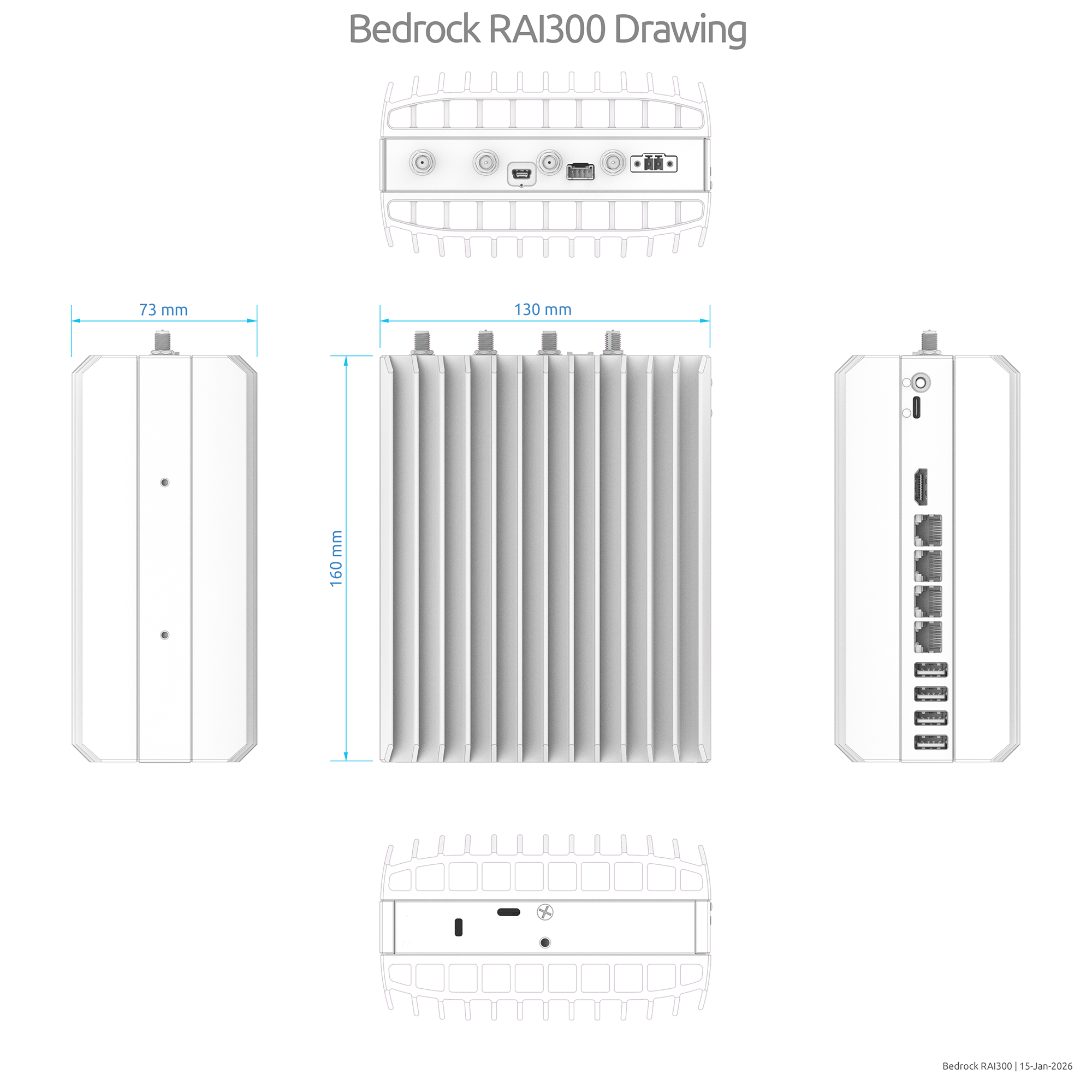 The compact footprint of Bedrock, robust structure, effective fanless cooling and DC input tolerance simplify Bedrock integration. All Bedrock I/O is brought to the front panel, with DC input and antennas in the top panel. The bottom and rear panel are both reserved for mounting, allowing full usability while Bedrock is mounted to a wall or to a desk.