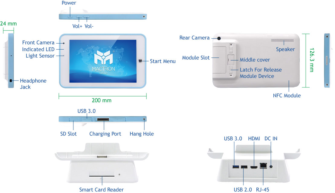 Front Camera 2.0MP / Rear Camera 8.0 MP / NFC/ Smart Card Reader/ Barcode Scanner/ Docking Station/ LAN Port/ MSR/ LTE Module